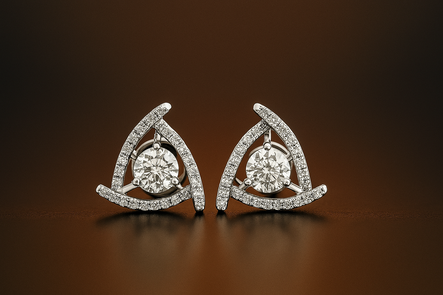Step into modern elegance with these Ladies Triangle Diamond Stud Earrings, a bold yet graceful expression of contemporary luxury. Crafted with precision, the unique triangular frame is encrusted with brilliant lab-grown diamonds and anchored by a stunning central solitaire that radiates timeless sparkle.