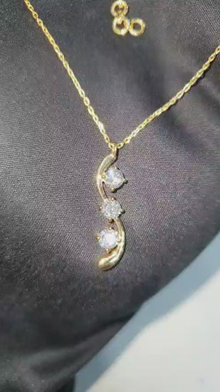 Gracefully designed to symbolize sophistication, this diamond pendant features three brilliant round-cut diamonds, delicately set in a flowing gold frame. The cascading arrangement creates a sense of harmony and movement, making it an ideal piece for both everyday wear and special occasions.